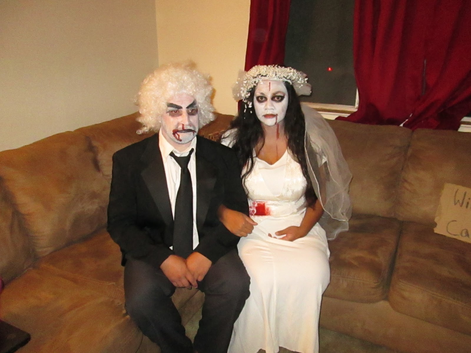 I got the dress for $3 from the thrift store and the head piece/veil was from a yard sale we went to a couple years ago for some yard decor aaron did for Halloween. All of Aaron's clothes were his and the wig was $3 from the thrift store. The makeup we got half off 2 days before Halloween from Rite Aid. I know right? Who would've thunk, the day before Halloween things would go on sale already.